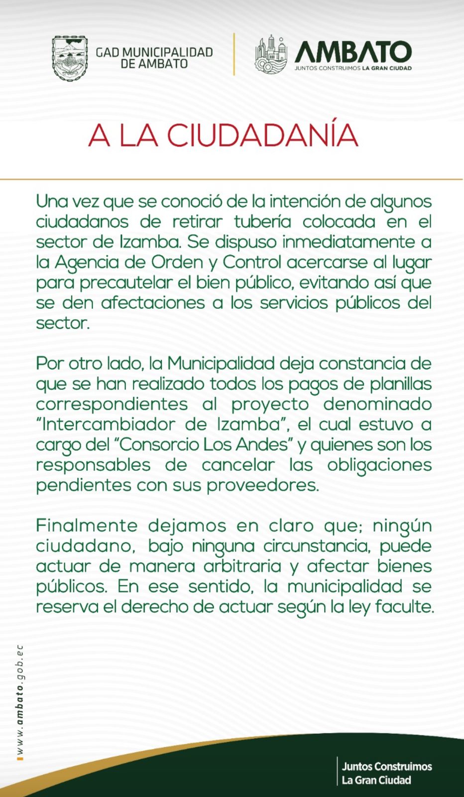 Al hacerse pública esta información, representantes del Municipio de Ambato y de Emapa, acudieron inmediatamente al sector y se habrían comprometido a ayudar al consorcio Amancha, para el cobro de la deuda, e insistieron en que por parte de la municipalidad no han quedados valores pendientes en esta obra.