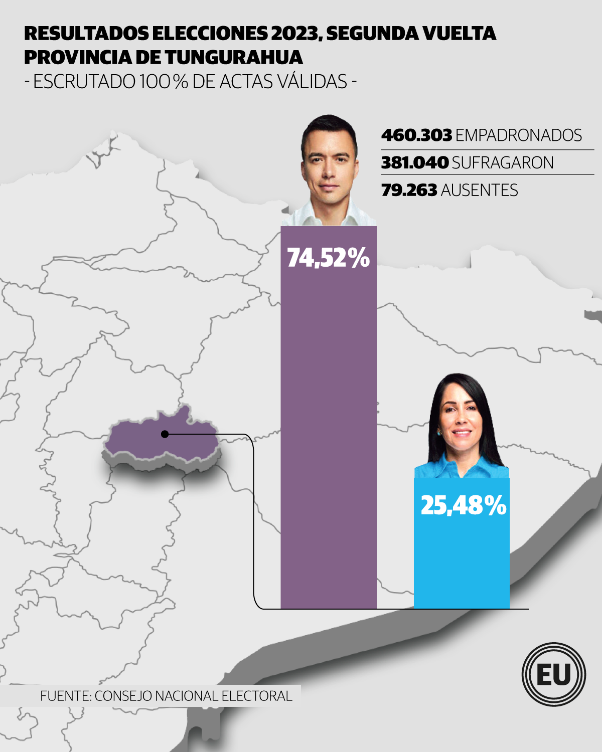 Con el 100% de actas escrutadas, Daniel Noboa se impone con el 60.963%, es decir, 217.932 votos, frente a Luisa González quien obtuvo un 20.06%, es decir, 78.884 votos. Estos resultados reafirman que el correísmo no tiene acogida en la provincia.