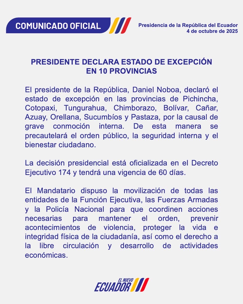 La decisión “busca detener las situaciones de las medidas de hecho tomadas en las provincias de Pichincha, Cotopaxi, Tungurahua, Chimborazo, Bolívar, Cañar, Azuay, Orellana, Sucumbíos y Pastaza, así como su radicalización, que se ha observado ha sido progresiva, evitando así mayor afectación a la población ecuatoriana”, reza el decreto ejecutivo.