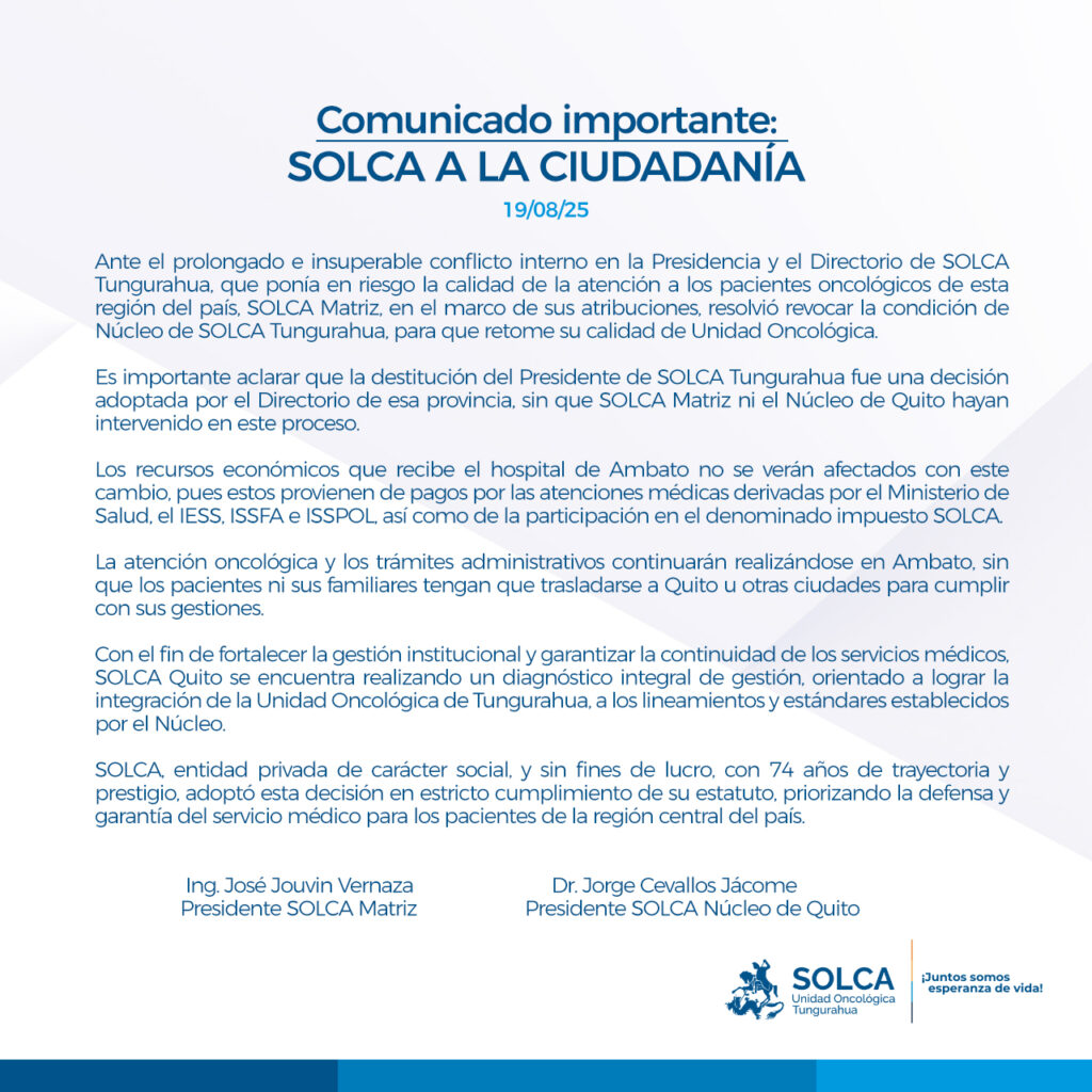 Debido a disputas por la presidencia y el cuerpo directivo de Solca, entre dos grupos de ciudadanos de Ambato, la matriz de Quito asumió el control administrativo de Solca. Preocupa que el Núcleo de Solca de Tungurahua deje de tener la condición de núcleo y pase a ser una estructura administrativa más bajo la dependencia de la Matriz de Solca en Quito.