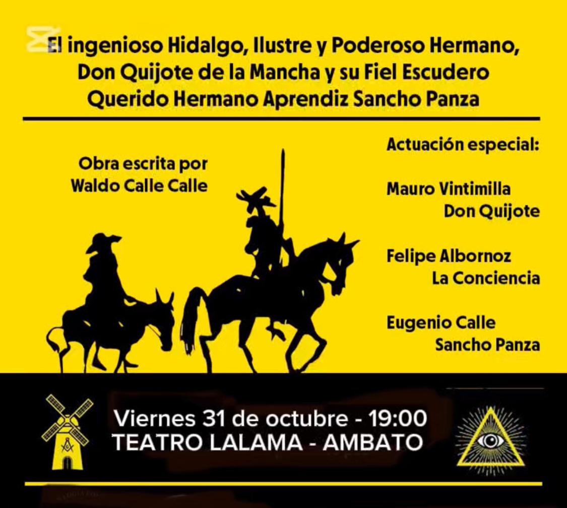 Este viernes 31 de octubre, en el Teatro Lalama, a las 19:00 horas, se presentará la obra de teatro “El Ingenioso Hidalgo Ilustre y Poderoso Hermano Don Quijote de la Mancha y su fiel escudero Querido Hermano Aprendiz Sancho Panza”, escrita por Waldo Calle.