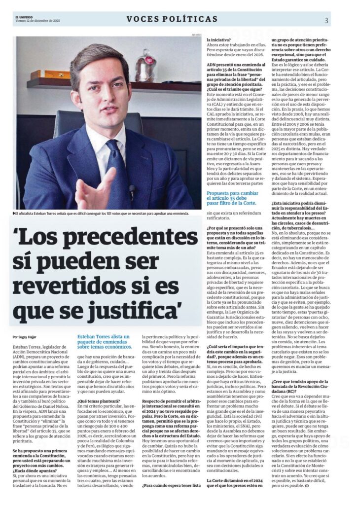 El asambleísta nacional, Esteban Torres Cobo, durante una entrevista en el medio La Posta, se refirió a la agenda de la Asamblea en 2026 y destacó que el trabajo estará enfocado en realizar reformas jurídicas y cambios constitucionales para garantizar el bienestar nacional.