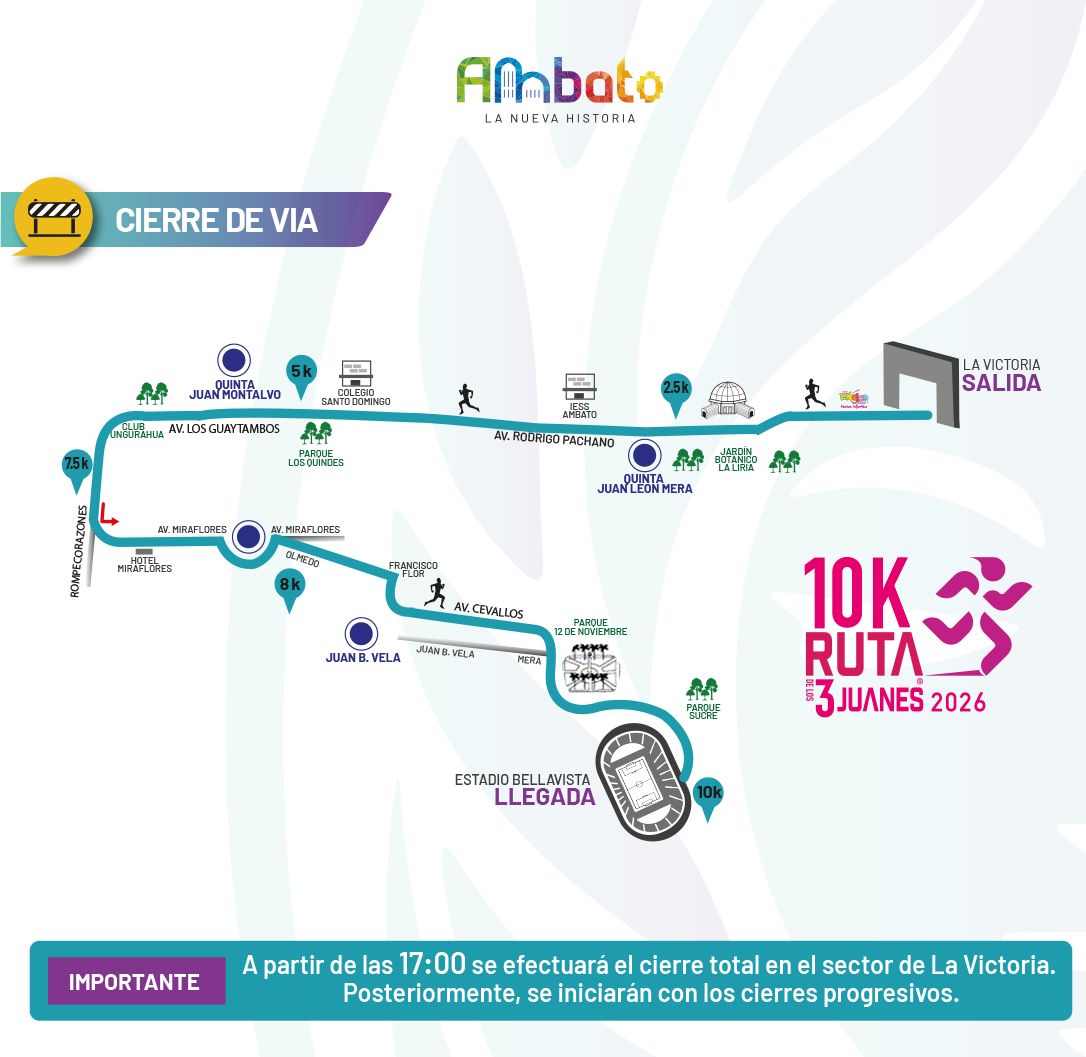 Como antesala a la Fiesta de la Fruta y de las Flores, Ambato vivirá una de las competencias atléticas más representativas de su calendario festivo: la 10K Ruta de los Tres Juanes, una carrera que combina deporte, tradición e identidad ambateña, y que año tras año convoca a miles de atletas locales, nacionales e internacionales. El cierre de vías está previsto para las 17h00, por lo que se recomienda tomar vías alternas y circular con precaución.