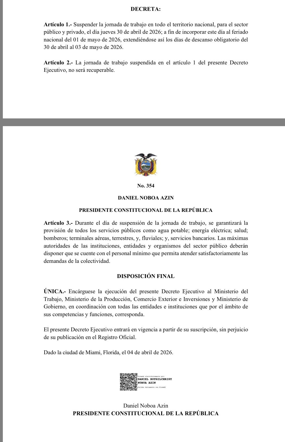 El presidente Daniel Noboa dispuso la ampliación del feriado por el Día del Trabajo mediante el Decreto Ejecutivo 354, firmado el 4 de abril de 2026. Con esta decisión, el asueto nacional arrancará el jueves 30 de abril y se extenderá hasta el domingo 3 de mayo de 2026. En el calendario original, el descanso únicamente contemplaba el viernes 1 de mayo.